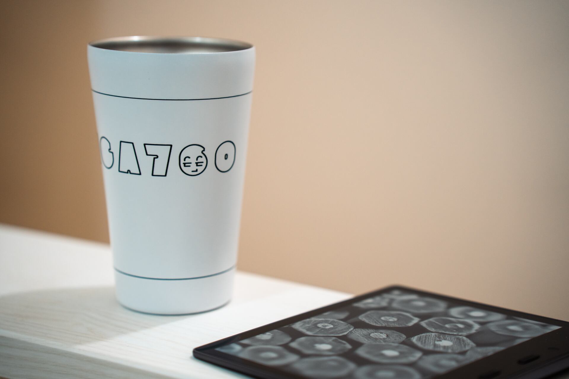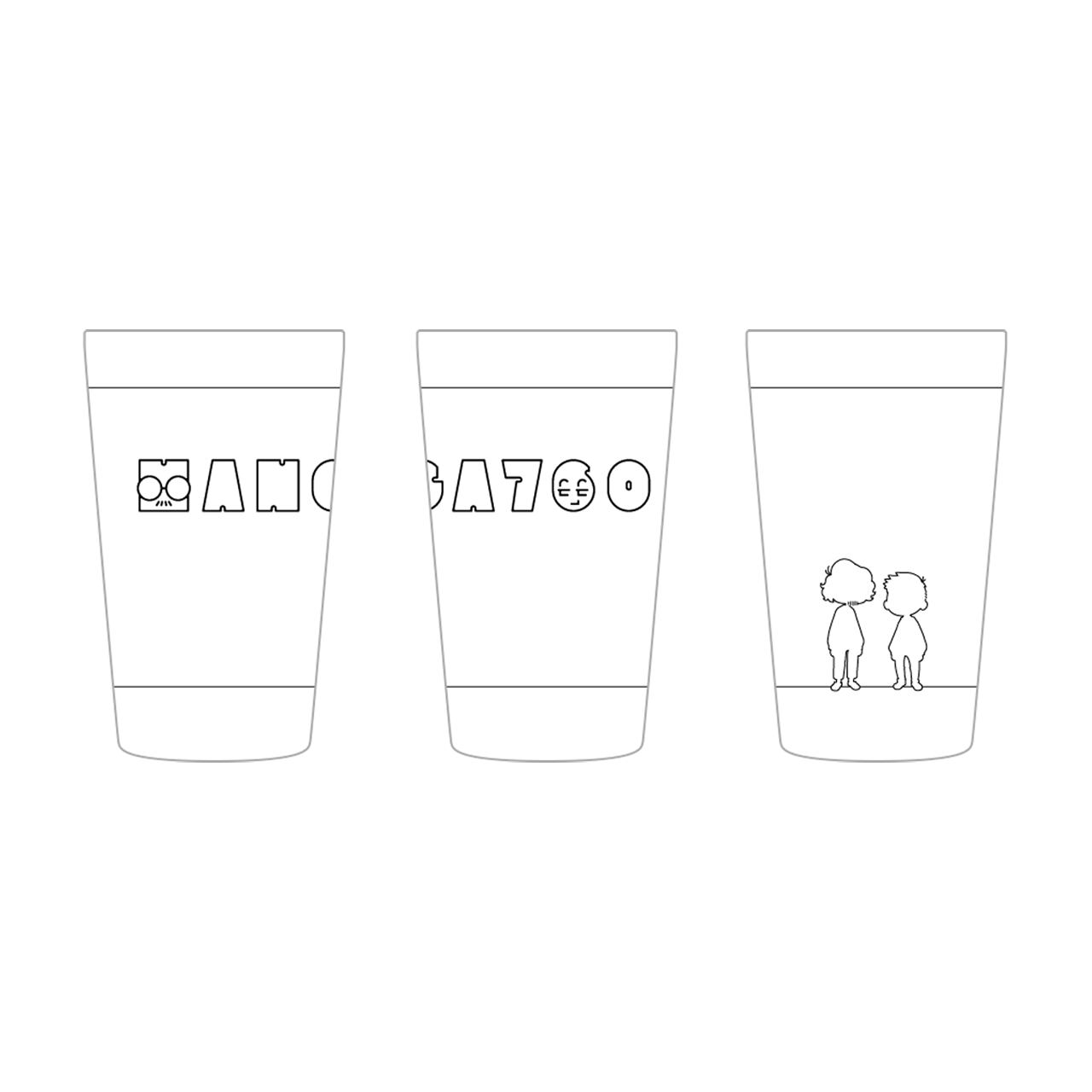 佐島とにわが潜んでいるロゴをあしらったタンブラー。2人のシルエットも配置し、優雅なマンガタイムを演出します。温かくても冷たくても、長時間「いい感じ」の温度をキープしてくれるので、一年中役に立つこと間違いなし。