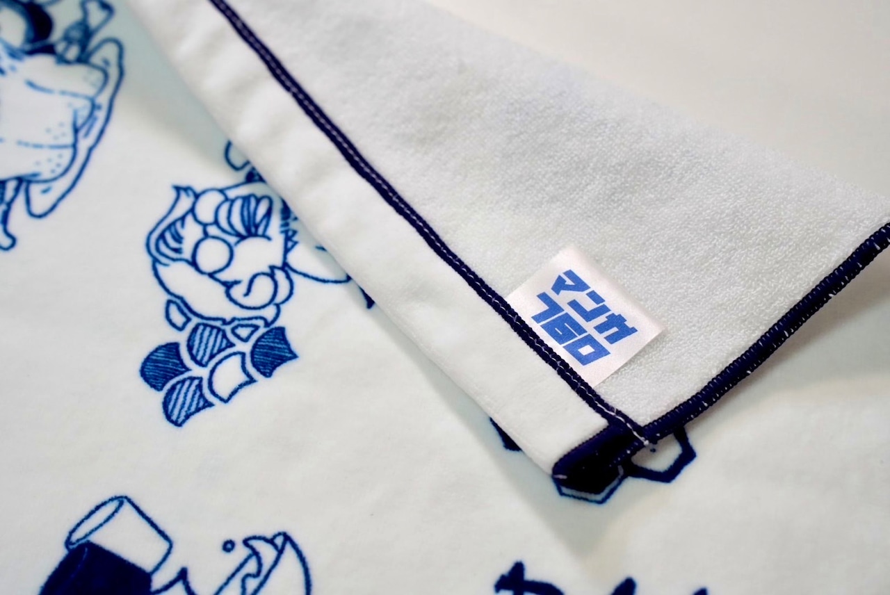 やけ食いをする佐島とにわのイラストがあしらわれた、手ぬぐい風のフェイスタオル。イラストとは裏腹に、汎用的に使えることで人気を博した一品。もちろんやけ食い時に使用も可。